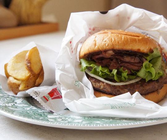 期間限定でフレッシュネスバーガーで発売中の、クラシックローストビーフバーガー。ガーリーな柄のグッズでおなじみの、キャス キッドソン創立25周年を記念してのコラボ商品で、バーガー袋がキャス キッドソン仕様になっていたり、フレッシュネスの日比谷店では店内がコラボらしく飾られたりしてるらしい。