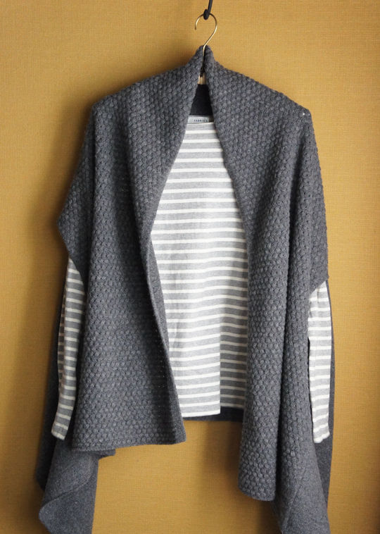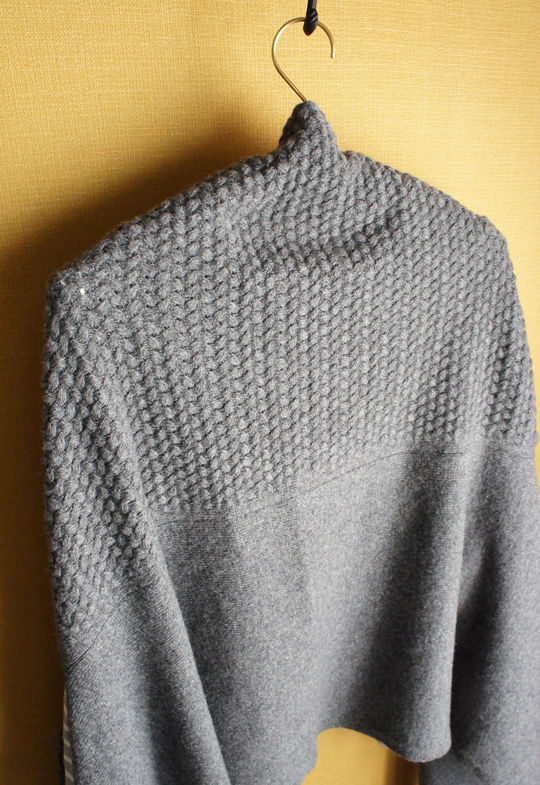 ニットは毛玉できるし虫に食べられるし、値段も立派なので、買うまでかなり悩んだけど、店に足を運ぶこと4回で決心。ありそうであまりないデザインなので、思い切って購入しました。厚みも、色が暗すぎず明るすぎないグレーなとこも好き。