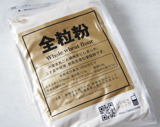 はじめて買ったので安いのか高いのか、基準がどうもわからない。製菓・製パンの材料を販売する、パイオニア企画という会社のもの。小麦粉のみより、全粒粉を入れた方がおいしい気がしました。