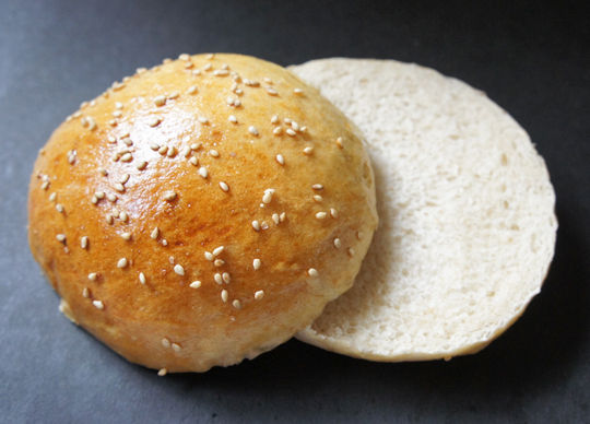 ちょっと前にハンバーガーのバンズを作って、似たような写真を掲載しましたが、以前は強力粉+小麦粉なのに対し、こちらは強力粉+全粒粉のバンズ。
