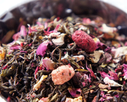 原材料は紅茶の他、ストロベリー、ラズベリー、赤スグリ、サワーチェリー、ローズレッド、ローズピンク、コーンフラワー、香料、と記載ありました。
