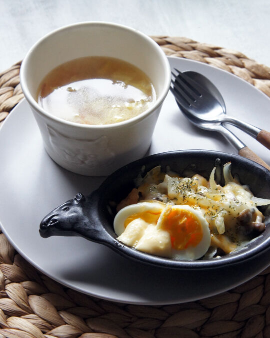耐熱皿だけどマット系の釉薬なので、ガチでオーブンや直火で使うと洗う時苦労しそうなので、ちょっとチーズを溶かす程度ぐらいでしか使わない予定。軽く温めもできるかわいい器という感じでキレイに使いたい。