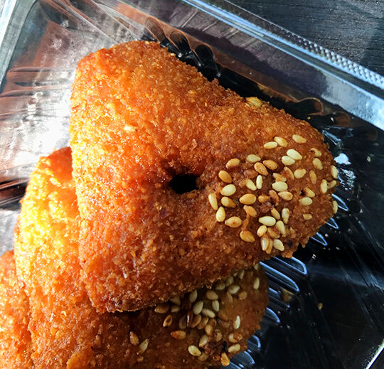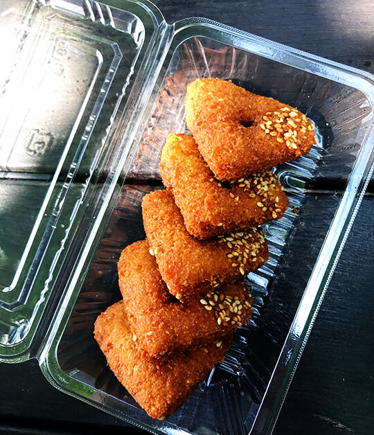 今回は袋にクナーファ、シロップ、ファラフェルの順に入れて渡されて。揚げたてのものと一緒に入れて大丈夫なのか心配で買った後にのぞいたら、このシロップが間に挟まっていたので、一応店員的に気を使って入れた保冷剤が溶けて液体化したもんだと勘違いしてしまった。