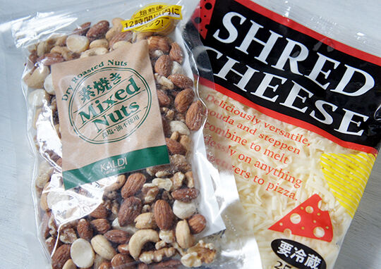 成城石井でも似たようなミックスナッツ、シュレッドチーズを買ったことあるけど、カルディの方が好み。特に素焼きミックスナッツは、開けると香ばしいにおいがして好き。