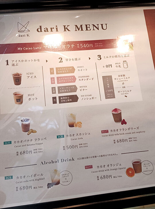 丸の内オアゾの丸善書店の近くにある、チョコレートのお店dari K(だりけー)。前から気になっていたので、試しにドリンクを買ってみることに。店内はイートインスペースもあるけど、今回はテイクアウトで利用。