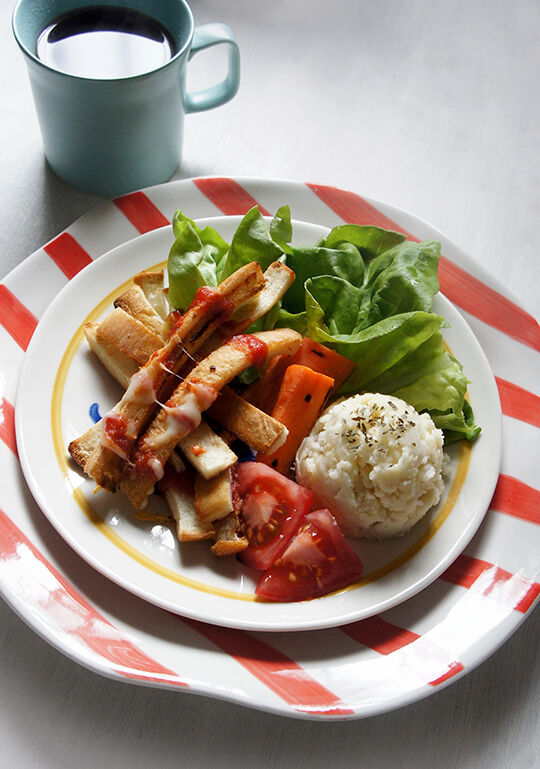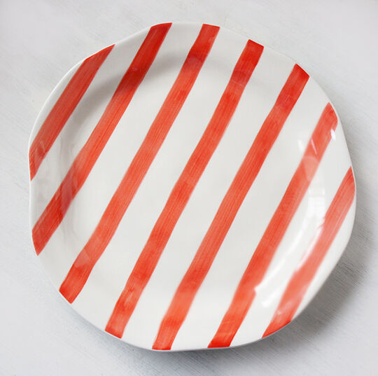 食欲をそそるカラーということもあり、思っていた以上に赤ストライプの皿は使い勝手よいかも。ハンバーガーとか、からあげとか。海苔巻きのせてもかわいいかもしれない。買ってよかった。