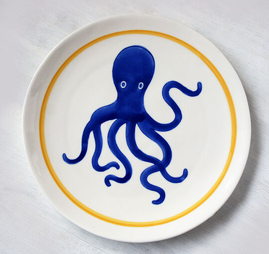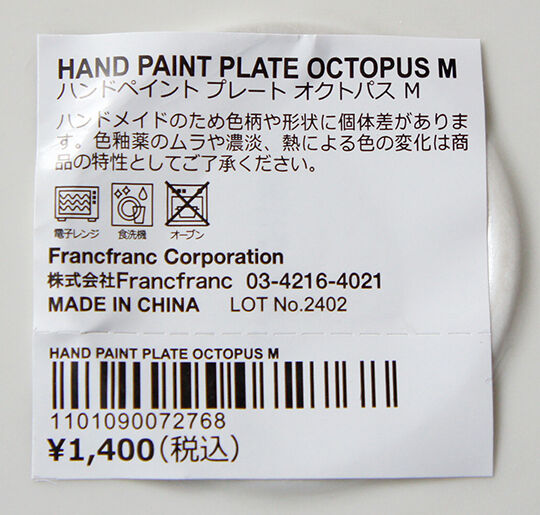 買ったのはタコとカニのみだけど、柄としてはヤシノキやアイスクリームもある。カニは青い部分が釉薬かかっていないので、使用するうち汚れが染みないかちょっと気になっている。ちなみに柄の正式名称はオクトパスとクラブ。