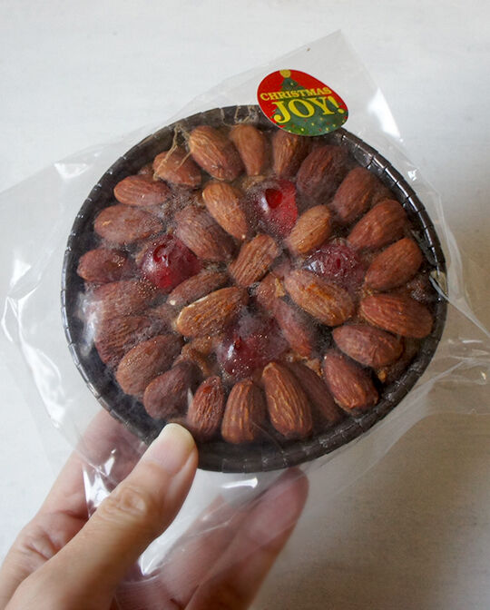 クリスマスが近いからケーキ食べたいけれど買いに行く気力がないと思っていた時に、紀伊国屋で見かけたダンディーケーキ。賞味期限が12月28日。これなら平日にわざわざ混雑するケーキ屋に行って買わなくてもすむなと思い購入。アーモンドたっぷりでおいしそうだし、食べたことのない菓子という点も惹かれた。